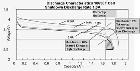 系统意外关机是使用便携设备时最令人不快的事情之一,大多数人应有同感。它轻则会降低客户满意度,重则会引起重要数据丢失和时间及金钱的重大损失。意外关机一般发生于电池电压降到支持系统所需的水平以下时。当负载增加时,电池电压会大幅度降低,尤其是放电行将结束时,这时放电曲线的斜率增加。为避免意外关机,Microchip使用了一种依据系统关机时能量需求信息的算法,如下图所示。电量计自动选择适当的关机点,以保证有足够的剩余能量向用户发出警示和保存数据。随着时间的推移,关机点也会变化。随着电池老化,满充容量下降,放电曲线的电压也发生改变。老化算法可调整关机点以确保能量不会随着电池老化而被浪费。